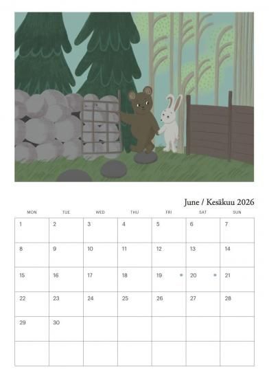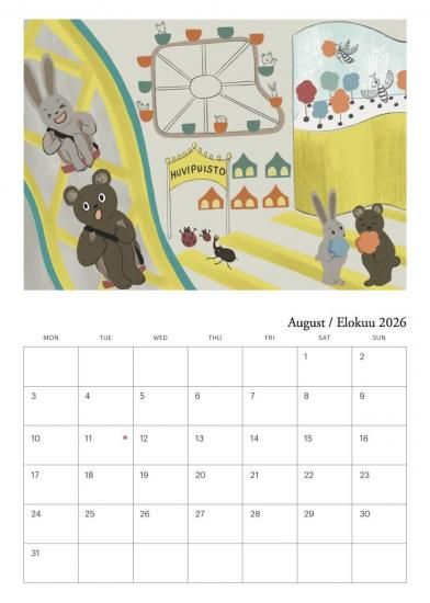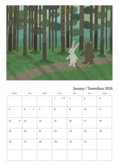 2026年のカレンダーは、フィンランドの絵本出版社Etana Editionsにて出版された絵本「Kurjen kartta – Seikkailu Aaltojen metsässä」(Crane's Map – Adventure in the Forest of the Aaltos)より登場したデザインとなっております。